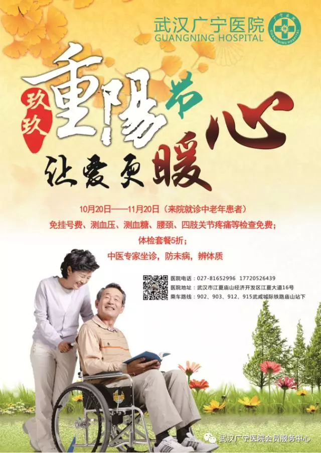 10月28日是中國的傳統節日——重陽節,為了弘揚中華民族尊老敬老的傳統美德,共建和諧社會,展現武漢廣寧醫院深厚的人文關懷,增強社會責任意識與奉獻意識。廣寧醫院為中老年人獻上自己的一份愛心,為中老年人做一些力所能及的事,送上對中老年人的一份關懷,特開展以下優惠回饋活動。
