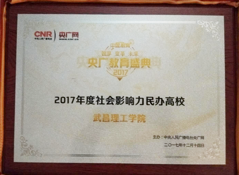 央廣網由中央人民廣播電臺主辦,是中央重點新聞網站。2017年度央廣網“中國教育+”開啟中國教育界最具影響力和前瞻力的教育盛典,經過網絡投票、專家評審等環節,憑借突出的辦學成效和廣泛的社會影響力,武昌理工學院全國數百所民辦高校中脫穎而出,獲評2017年度社會影響力民辦高校,全國僅5所高校獲此殊榮,武昌理工學院排名榜首。