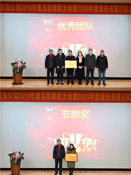 隨后人事部經理褚曉毅宣讀了《后勤公司2019年度評優評先表彰決定》。對2019年工作中表現優異的團隊和員工進行表彰,其中,表彰優秀團隊1個、節能獎團隊1個、優秀管理獎6人、優秀員工15人、學生滿意檔口2個、學生滿意商鋪1個,與會領導分別為優秀團隊和個人頒獎。