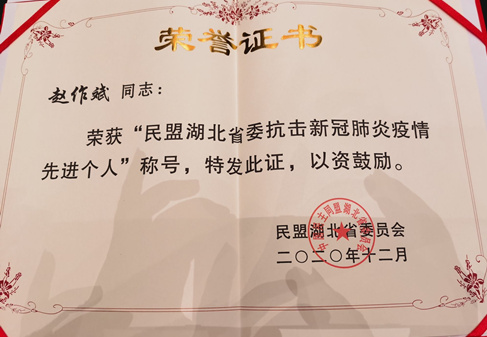 廣信科教集團董事局主席、總裁趙作斌榮獲“民盟湖北省委抗擊新冠肺炎疫情先進個人”稱