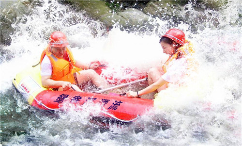 在上游平緩處,水流撞擊著皮艇輕輕搖蕩時,每個人都在期待。直到在有落差的地方向下俯沖,清涼的溪水擊打到身上、臉上,那便是一種灌入心頭的清涼,讓人直呼夠勁!