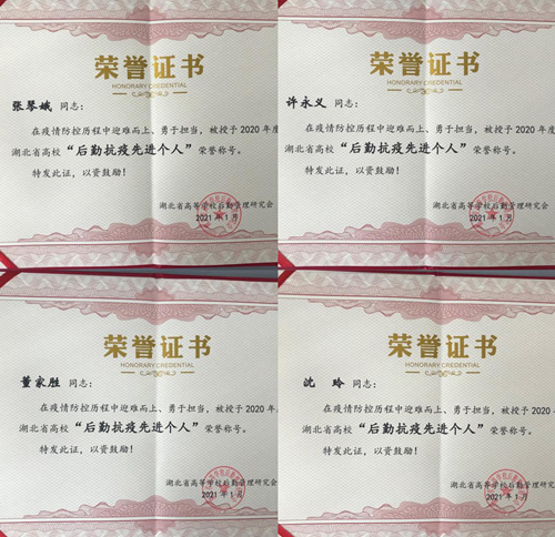 樓棟管理部經理張琴娥、飲食部梅園經理許永義、樓棟管理部東區片長沈玲、商學院樓管員董家勝分別被評為湖北省高校“后勤抗疫先進個人”。