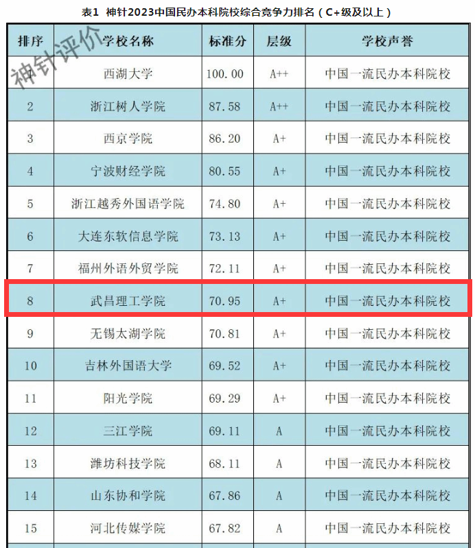 在神針2023中國民辦本科院校綜合競爭力排名中,評價結果顯示,武昌理工學院位居全國第8位、湖北省第1位,獲評為中國一流民辦本科院校。此外,在2023中國民辦本科院?蒲懈偁幜ε琶,武昌理工學院位居全國同類高校第8位,湖北省同類高校第1位。學校同時獲得2023中國民辦本科院校科研競爭力增值評價排名第1位,是目前處于最佳科研生態位的民辦本科院校。